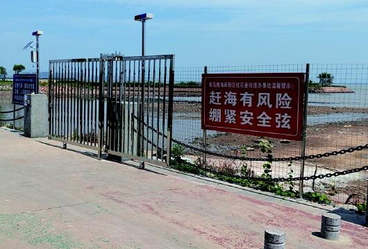 泥灘入口處新安裝大鐵門,旁邊設(shè)有安全提醒牌