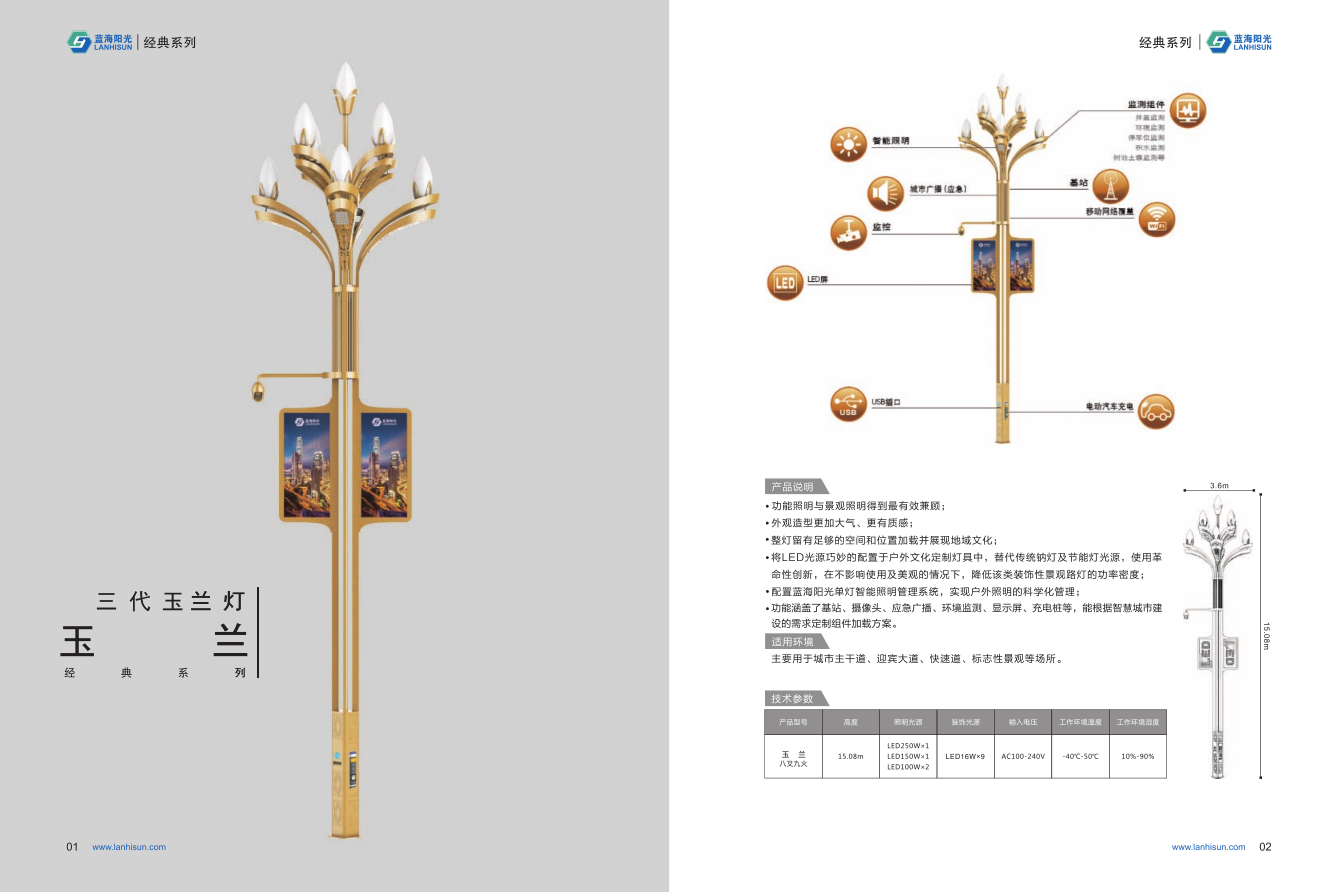 1、高度為6-16米; 2、花葉光源為4組LED光源,色溫2500-6500K,燈罩光源為9只LED裝飾光源,每個光源功率為30-60W; 3、LED驅動電源壽命可達五年; 4、整體熱鍍鋅噴塑,保證燈桿15年不生銹; 5、可以根據使用地區的地域文化、產業特點等進行文化定制;