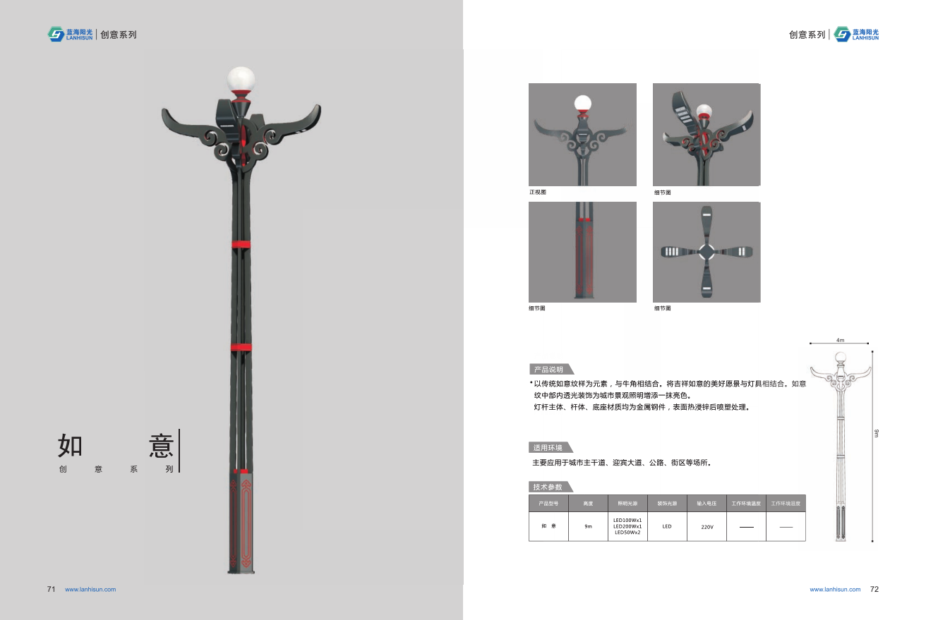 1、高度為6-16米; 2、花葉光源為4組LED光源,色溫2500-6500K,上部燈罩光源為LED裝飾光源,每個光源功率為30-60W; 3、LED驅動電源壽命可達五年; 4、整體熱鍍鋅噴塑,保證燈桿15年不生銹; 5、可以根據使用地區的地域文化、產業特點等進行文化定制;