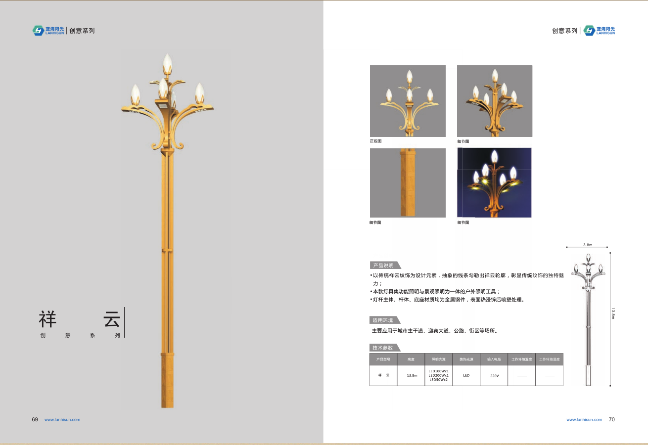 1、高度為6-16米; 2、花葉光源為4組LED光源,色溫2500-6500K,其余光源為LED裝飾光源,每個光源功率為30-60W; 3、LED驅(qū)動電源壽命可達(dá)五年; 4、整體熱鍍鋅噴塑,保證燈桿15年不生銹; 5、可以根據(jù)使用地區(qū)的地域文化、產(chǎn)業(yè)特點等進(jìn)行文化定制;