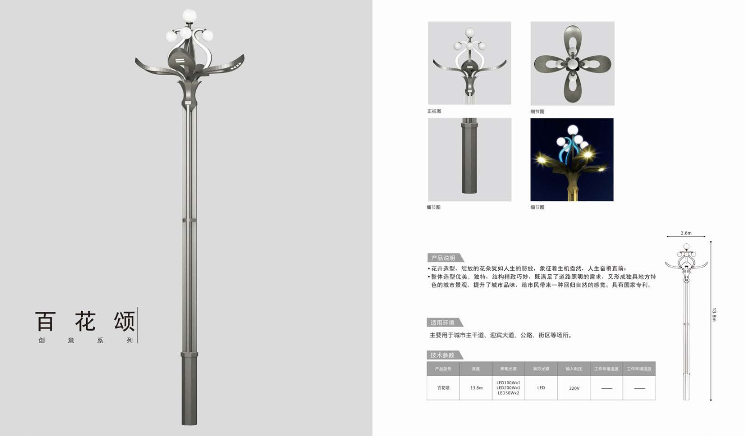 1、高度為6-16米; 2、光源為4組LED光源,色溫2500-6500K,每個光源功率為60-300W,頂部為七彩球構成; 3、LED驅動電源壽命可達五年; 4、整體熱鍍鋅噴塑,保證燈桿15年不生銹; 5、可以根據使用地區的地域文化、產業特點等進行文化定制;